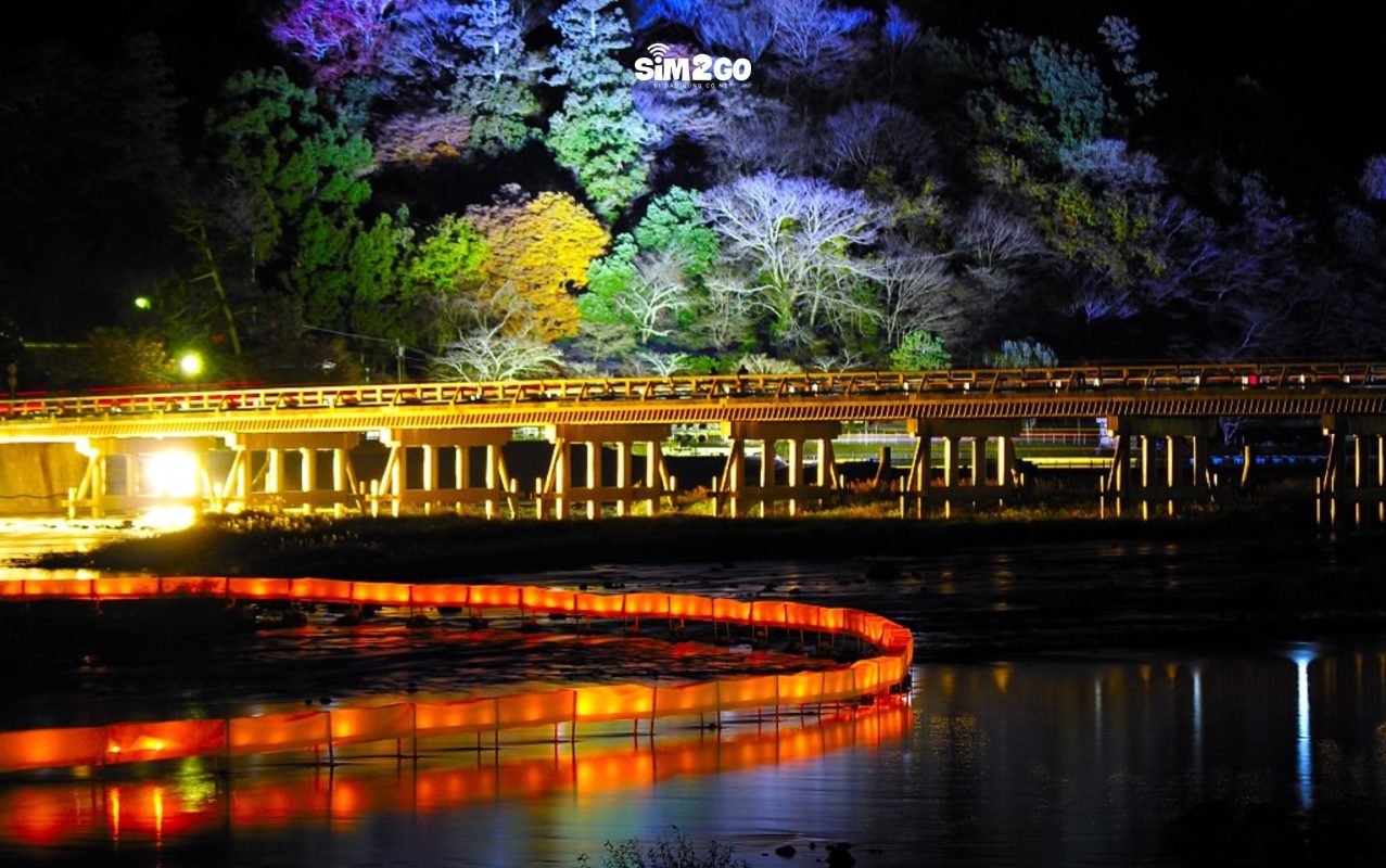 Arashiyama Hanatoro được tổ chức tại Arashiyama, một thị trấn nổi tiếng với du khách nhờ môi trường tự nhiên phong phú và không khí yên bình. Vào tháng 12, hãy chiêm ngưỡng cảnh đẹp tuyệt vời của Cầu Togetsukyo và Sông Katsura khi chúng được thắp sáng trong màn đêm.