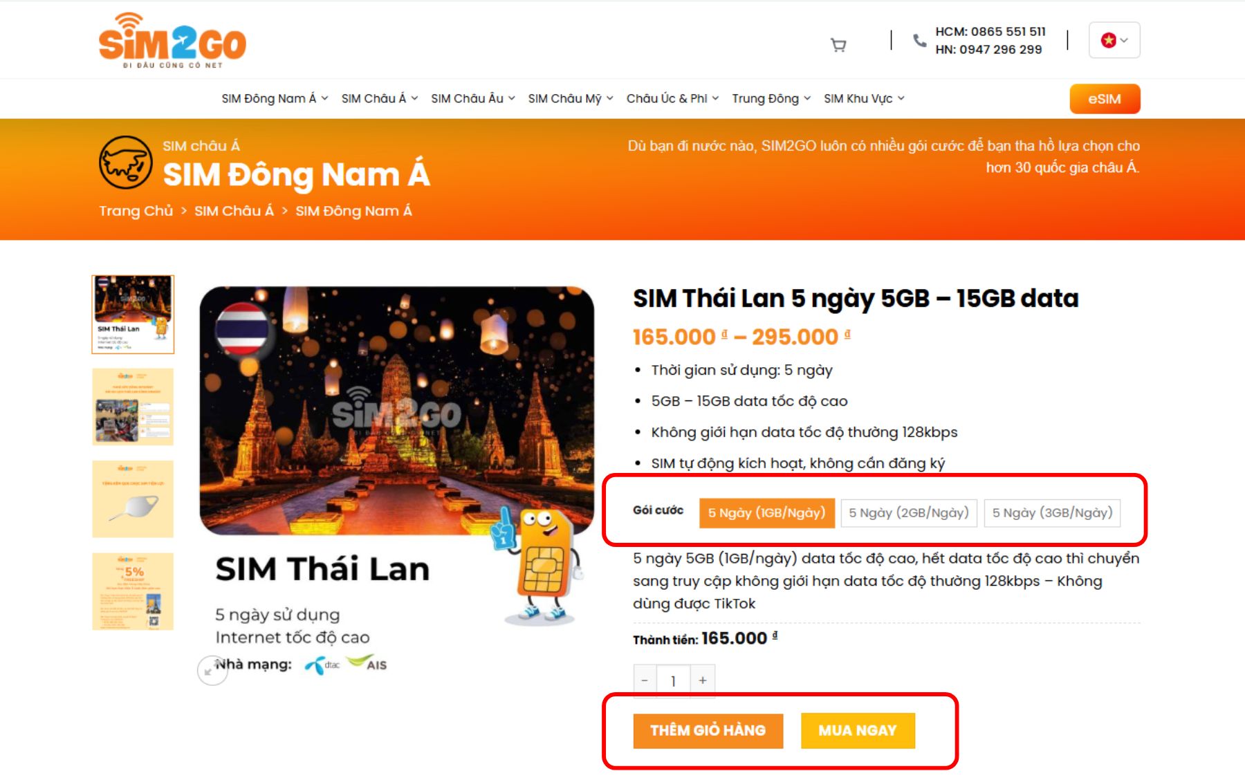 Bước 3: Chọn gói cước SIM/eSIM phù hợp và bấm “THÊM VÀO GIỎ” (nếu muốn tiếp tục xem thêm sản phẩm khác) hoặc “MUA NGAY” (nếu muốn đến trang thanh toán).