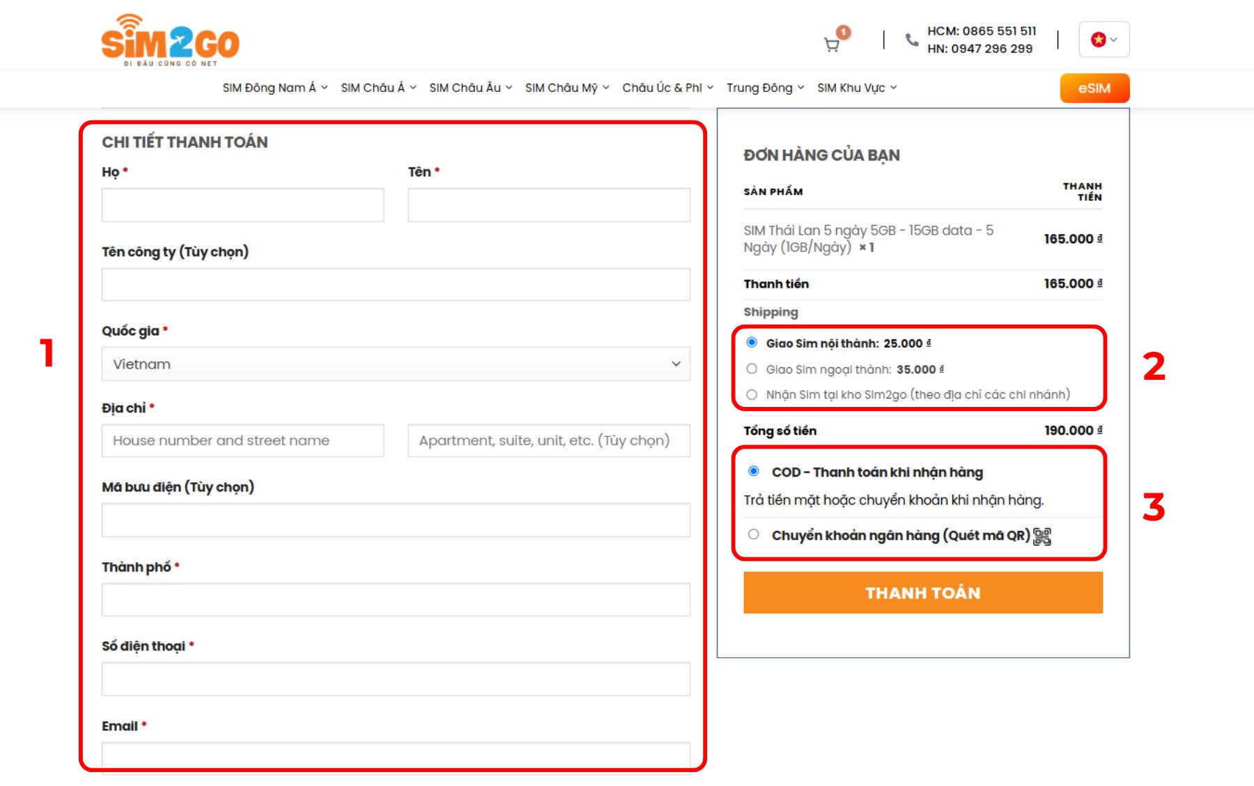 - (1) COD – Thanh toán khi nhận hàng: SIM2GO hỗ trợ thanh toán COD trên toàn quốc.