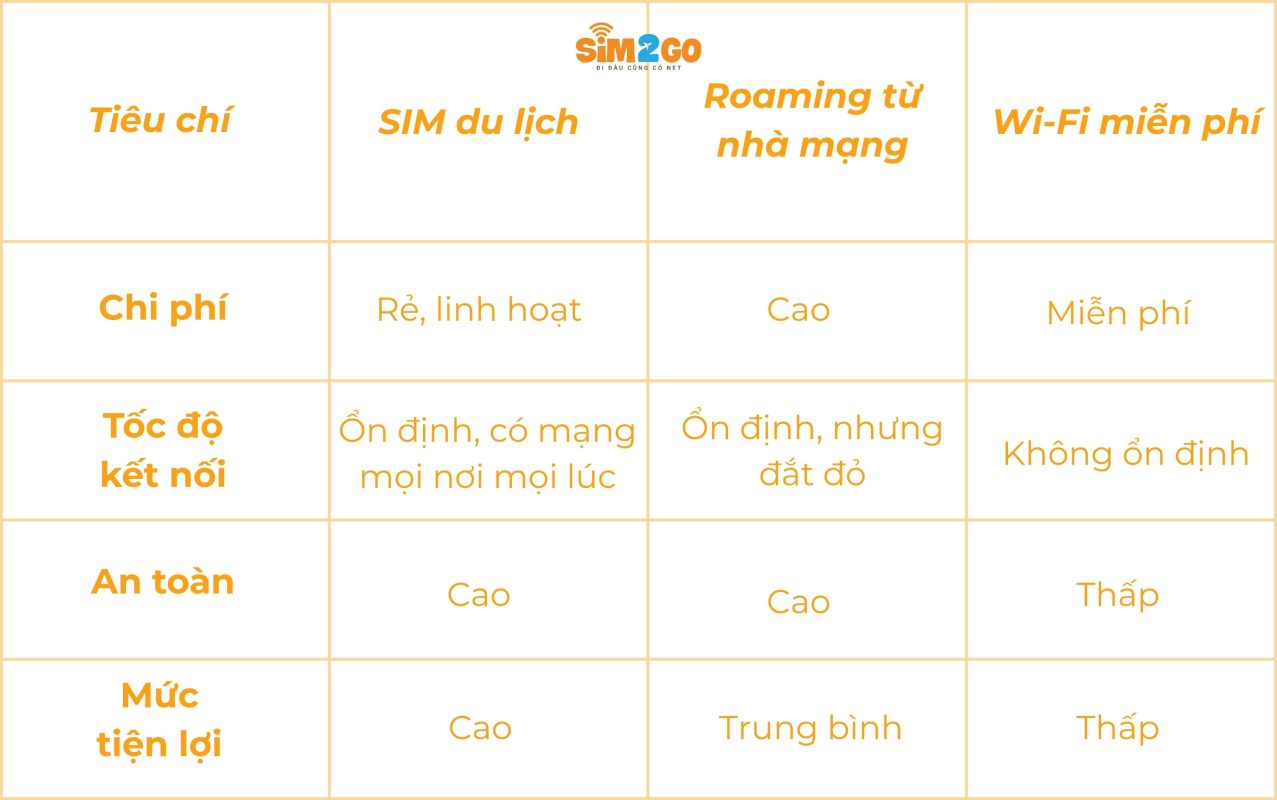Dưới đây là bảng so sánh chi tiết để bạn có thể dễ dàng lựa chọn giải pháp phù hợp nhất cho chuyến đi của mình.
