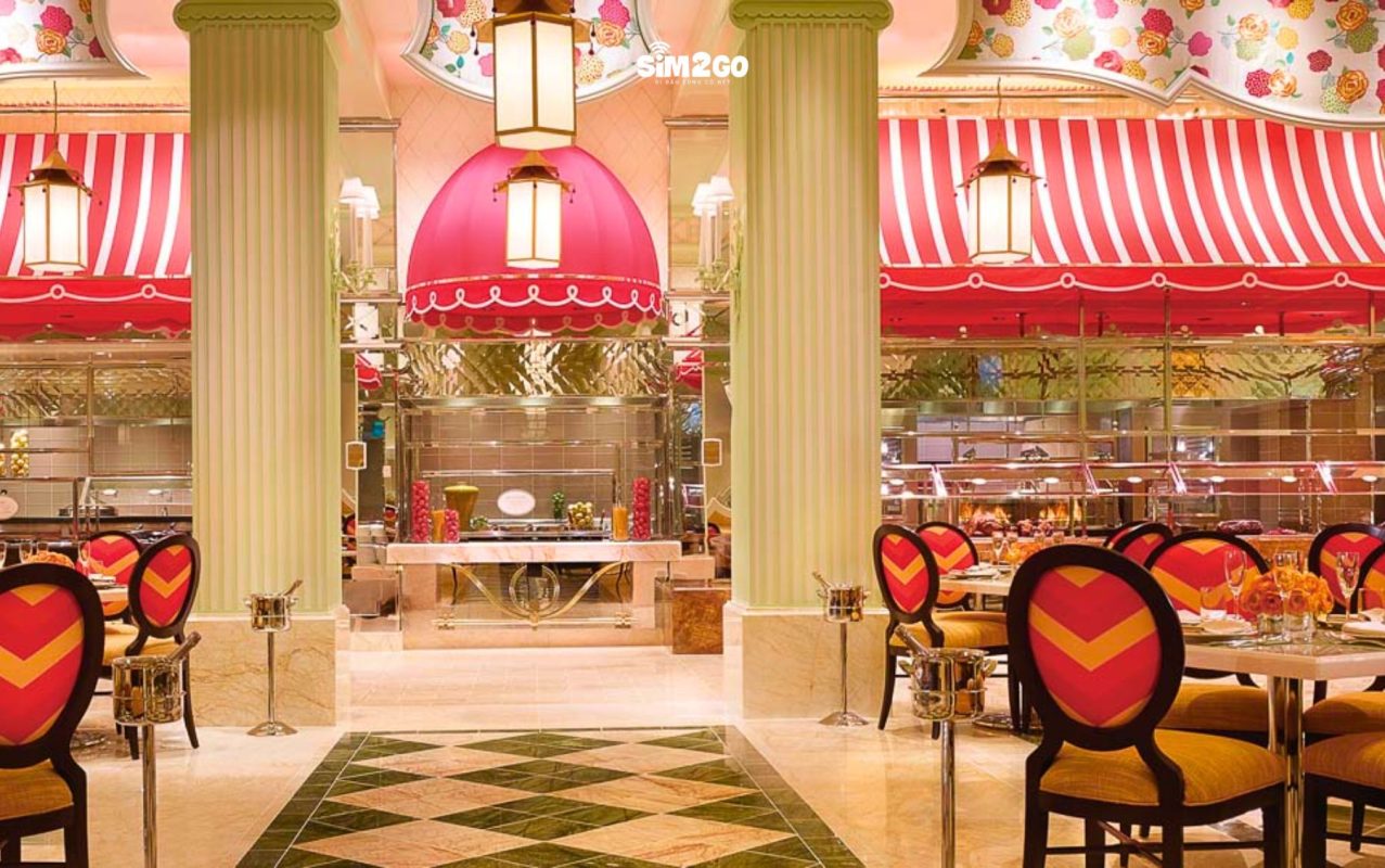 The Buffet tại Wynn (Wynn Las Vegas) mang đến không gian rộng thoáng với các chậu cây cắt tỉa nghệ thuật, mái che rực rỡ sắc màu, và một đài phun sô cô la khổng lồ làm điểm nhấn, cùng với những món ăn tuyệt vời. Nơi đây kết hợp sự đa dạng của buffet truyền thống với phong cách ẩm thực sang trọng. Bạn có thể lựa chọn từ hơn 120 món ăn khác nhau. Các món nổi bật khác bao gồm tacos đường phố, sườn nấu với Guinness, và quầy sushi với sushi được chế biến theo yêu cầu, tươi ngon ngay tại chỗ.