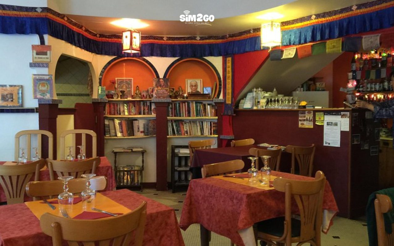 Không gian được trang trí theo phong cách Tây Tạng với hình ảnh Đức Đạt Lai Lạt Ma, cờ Lung Ta và các biểu tượng văn hóa đặc trưng, tạo nên một trải nghiệm ẩm thực độc đáo và gần gũi.